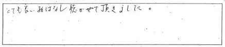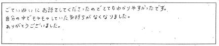 ごていねいにお話をしてくださったのでとてもわかりやすかったです。自分の中でモヤモヤしていた気持ちがなくなりました。ありがとうございました。
