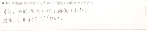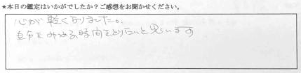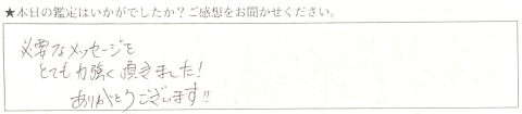 自分の未来の予測をしてもらえたので、どんな事が起こるのかわかってそれに対処していこうと思えた。思った程、良い道のりではないが頑張ってみようと思えました。