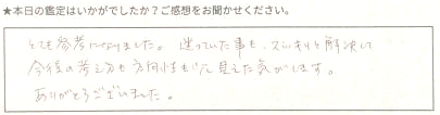 とても参考になりました。迷っていた事も、スッキリ解決して、今後の考え方も方向性もすべて見えた気がします。ありがとうございました。