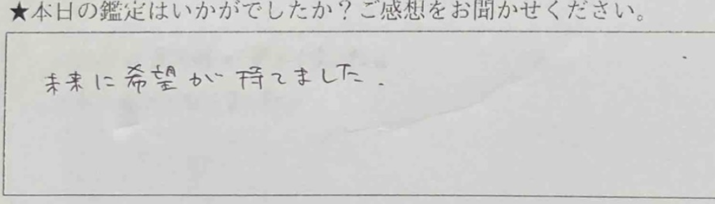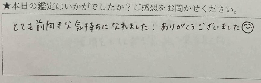 鑑定ありがとうございました。お話を聞くことができ、元気が出ました。恋愛や仕事へのモチベーションも上がり、明日からの活力となることができ、本当に感謝しています。