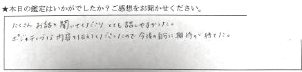 たくさんお話を聞いてくださりとても話しやすかった。ポジティブな内容を伝えてくださったので今後の自分に期待が持てた。