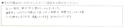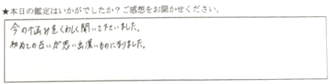 今の悩みを詳しく聞いてくださいました。初めての占いが思い出深いものになりました。