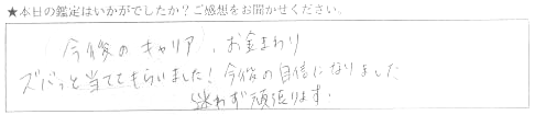 今後のキャリア、お金まわりズバッと当ててもらいました!今後の自信になりました。迷わず頑張ります。