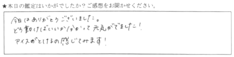 言っていただくことがズバズバ当たっていて驚きました。これからのこと、恋愛のこと、とても心強いお言葉ばかりで元気が出ました。滑らないようにアドバイスいただいたように頑張ります♡ありがとうございました。