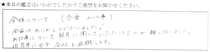 今後について(恋愛、お仕事)。今日はありがとうございました!お仕事について親身に聞いていただけて心が軽くなりました。10月末に必ず会社を退職します。