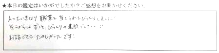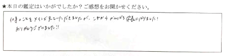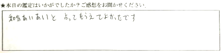 当日の突然予約でしたが、スムーズに対応していただきありがとうございました。楽しくお話しながら鑑定していただき、ウジウジ悩んでいることの道筋示していただき、スッキリしました。とても充実した時間でした。