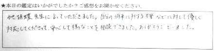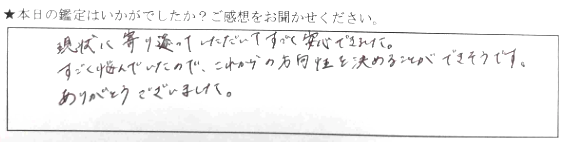現状に寄り添っていただいてすごく安心できました。すごく悩んでいたので、これからの方向性を決めることができそうです。ありがとうございました。
