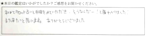 楽しい雰囲気の中で占ってもらい、とても良い時間でした。タロットや算命学、手相など様々な占いも楽しく、未来に希望が持てもした‼︎ありがとうございました。