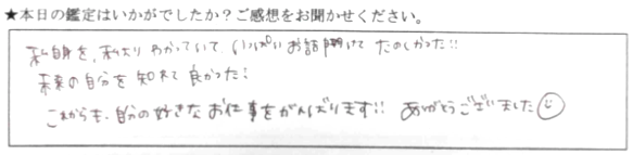私自身を、私よりわかっていていっぱいお話聞けて楽しかったです!未来の自分を知れて良かった!これからも自分の好きなお仕事を頑張ります!ありがとうございました😄