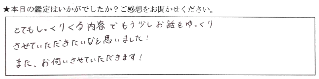 とてもしっくりくる内容でもう少しお話をゆっくりさせていただきたいなと思いました!また、お伺いさせていただきます!