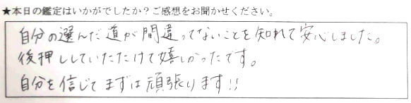 悩んでいたことが、スッキリしました!彼がどう思っているか、少し分かった気がして、心が軽くなりました!来てよかったです!ありがとうございました!