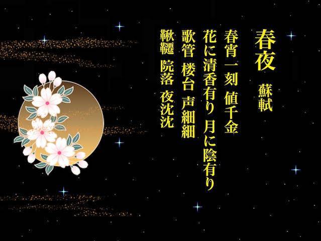 「春の夜は、ほんの僅かな時でも千金の価値がある。花は清らかに香り月はおぼろにかすんでいる」